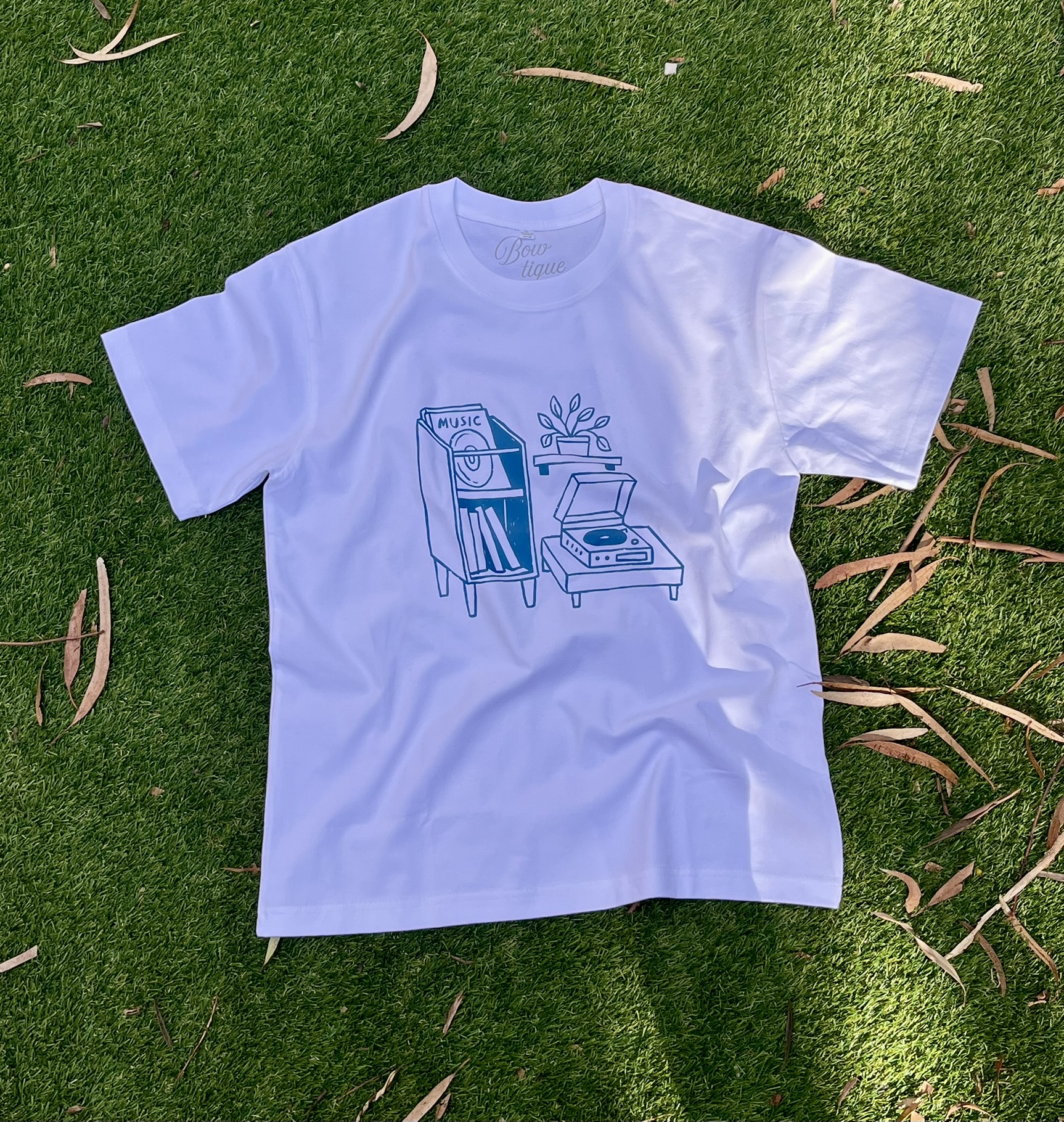Your perfect companion for chill days and deep cuts. This Lo-Fi-inspired Tee features a clean, blue line art graphic of a record player, vinyl shelf, and houseplant—the ultimate listening station.