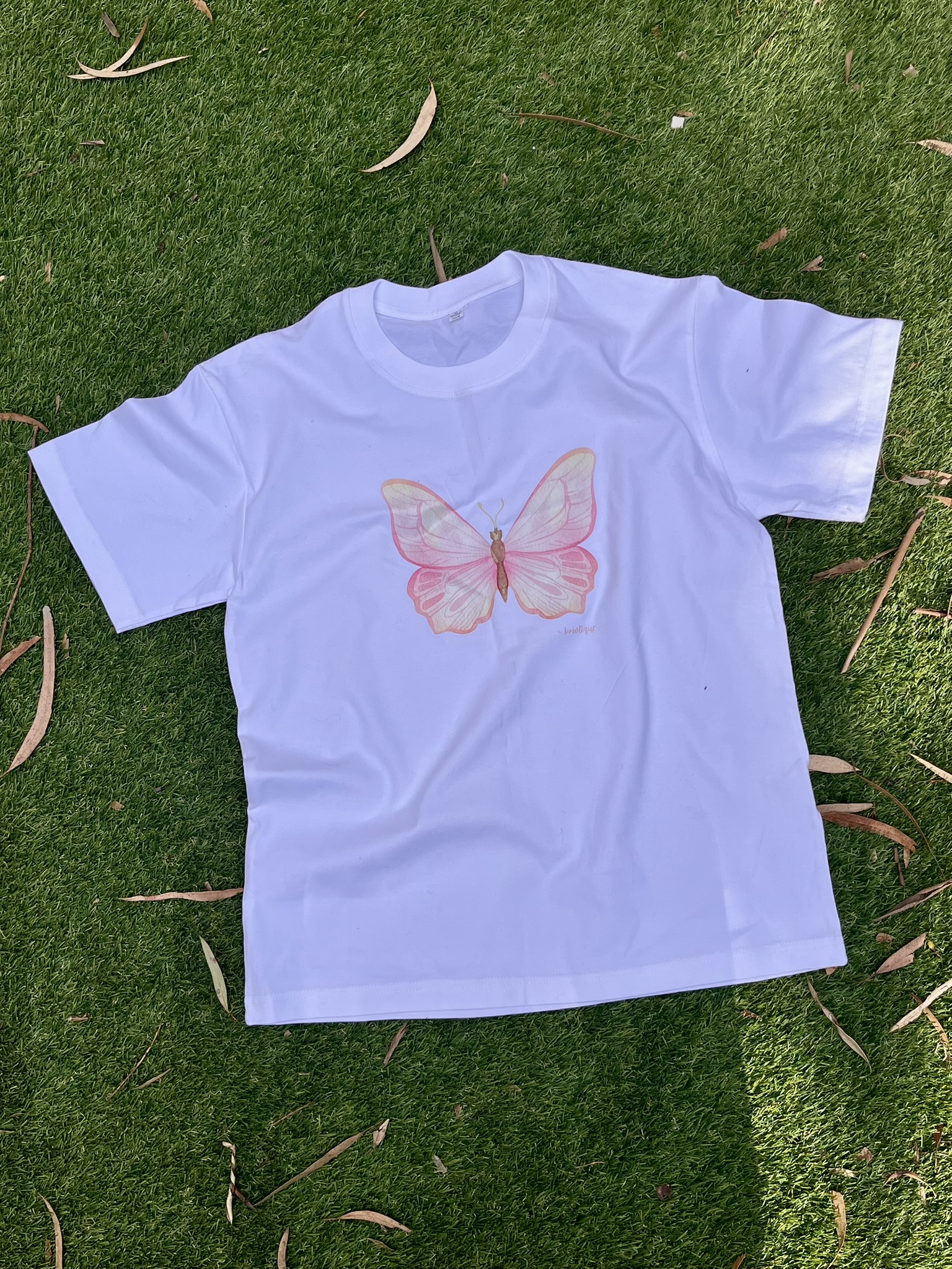 Embrace effortless charm with this watercolor butterfly Tee. Featuring a delicately rendered, soft pink butterfly, this T-shirt captures the beauty of a moment in flight.